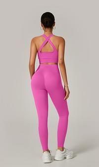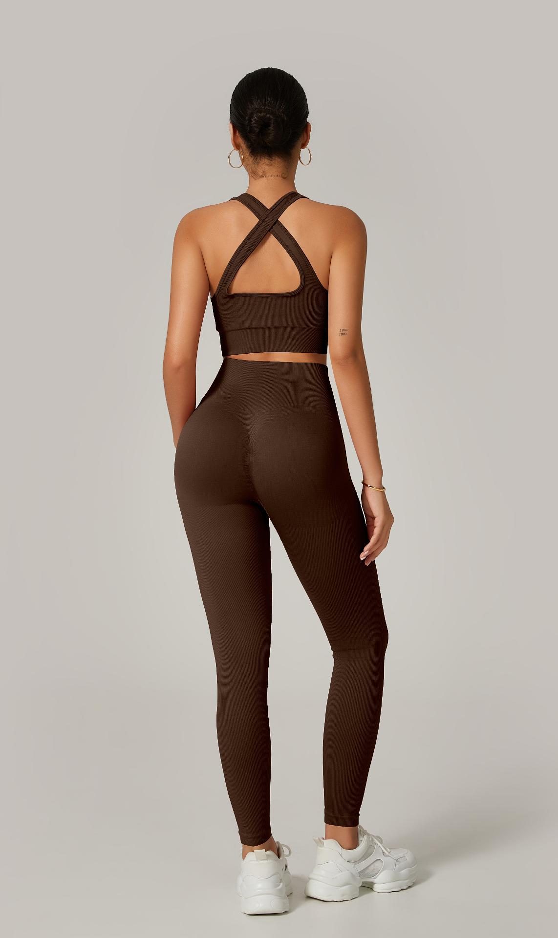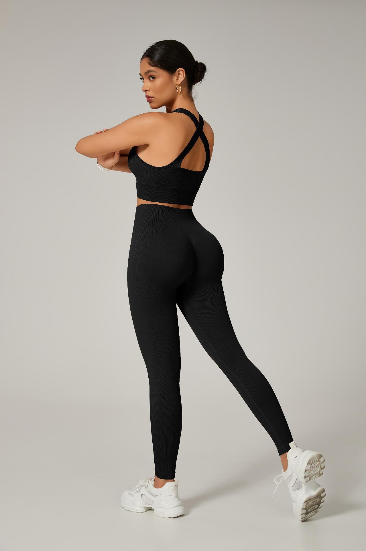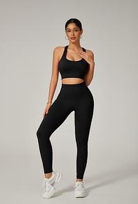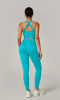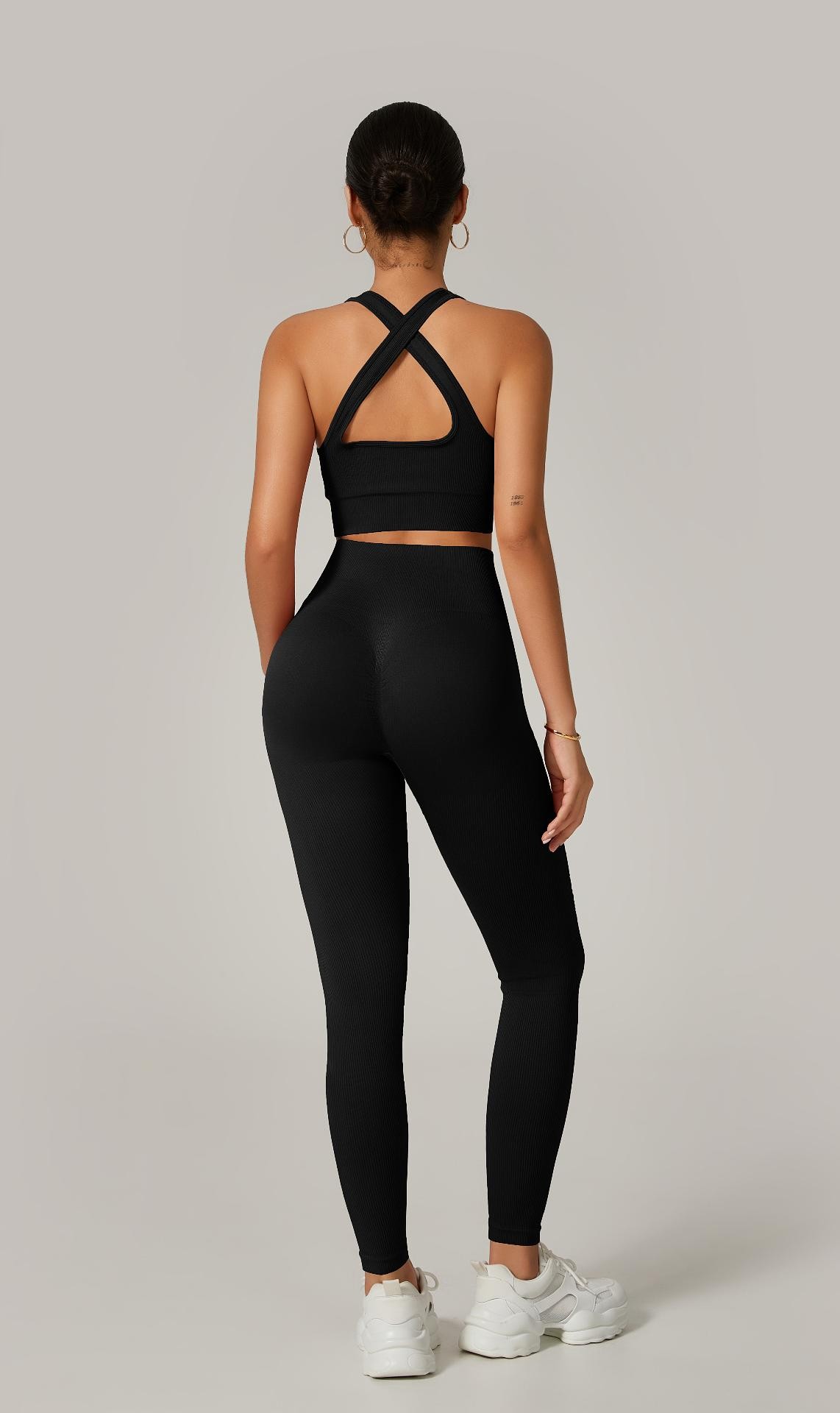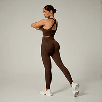 A legging com cintura alta e efeito empina natural valoriza o corpo e modela a silhueta, enquanto o top com alças grossas cruzadas nas costas proporciona sustentação e um visual moderno e poderoso.