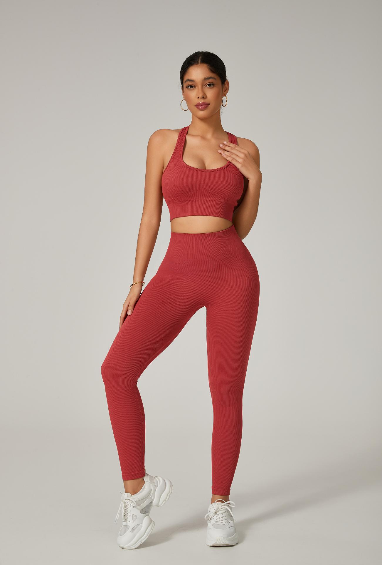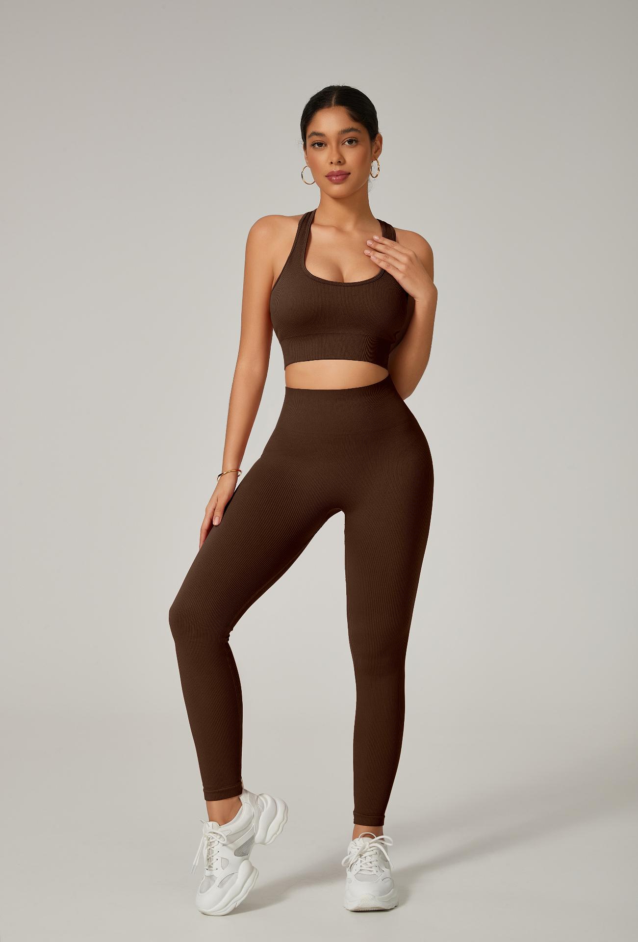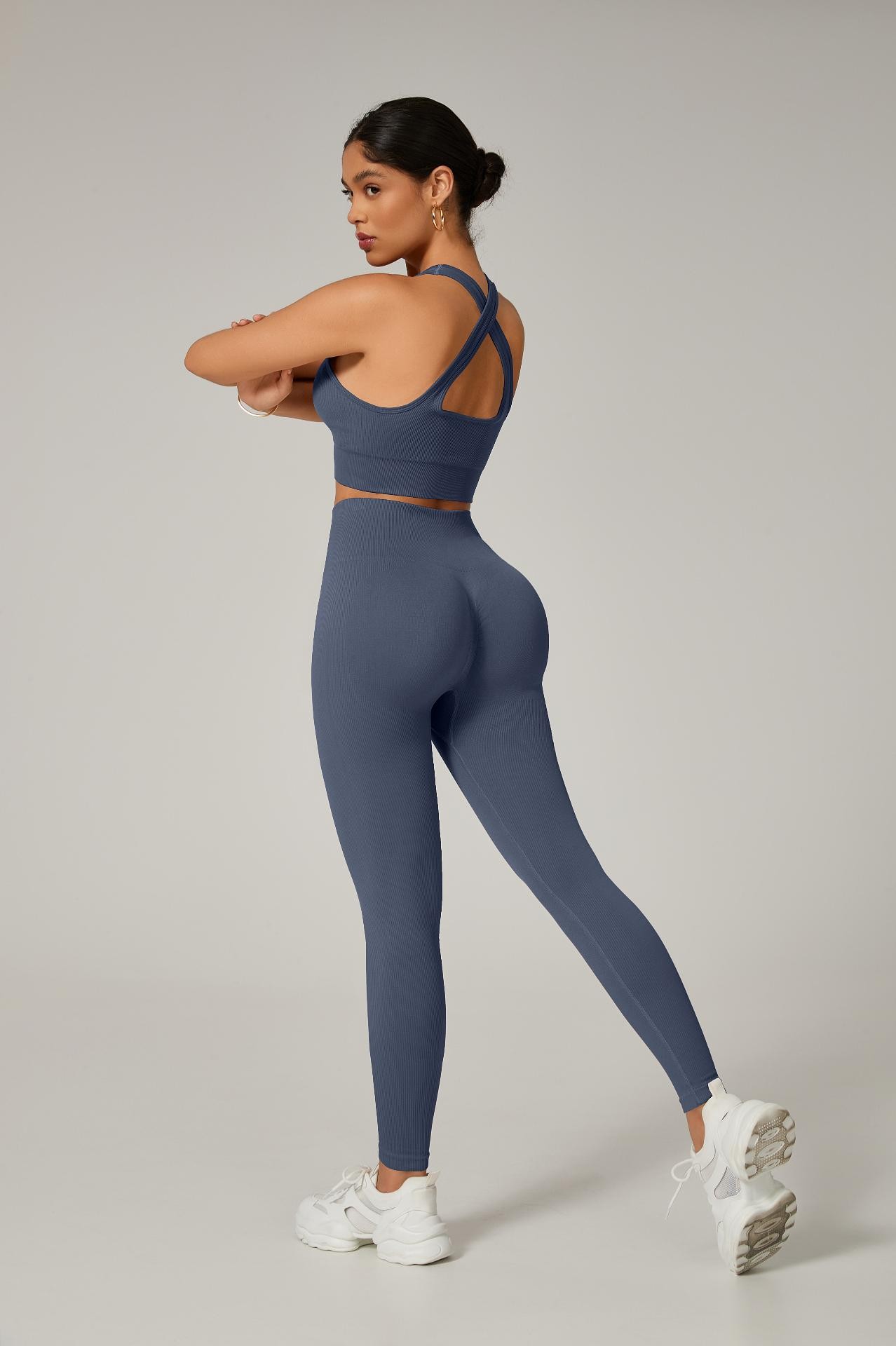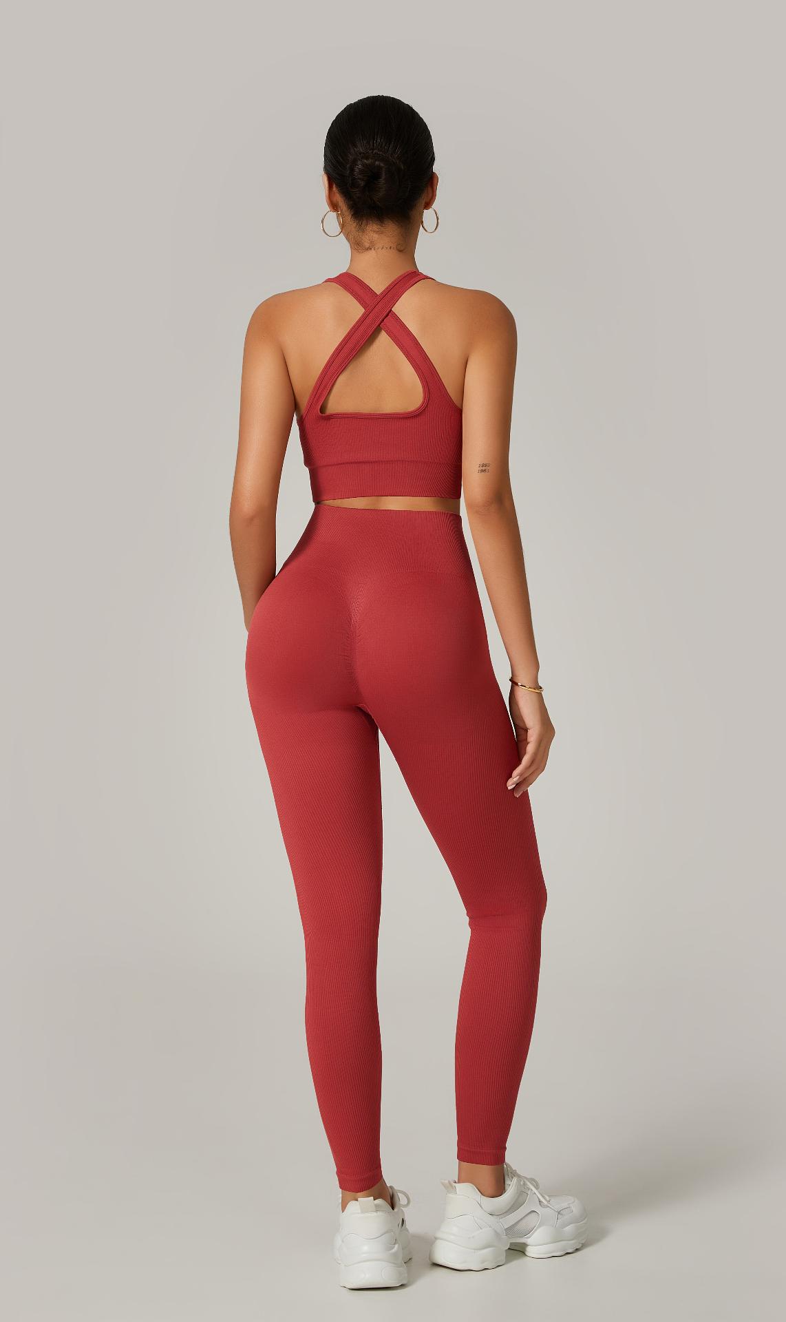 A legging com cintura alta e efeito empina natural valoriza o corpo e modela a silhueta, enquanto o top com alças grossas cruzadas nas costas proporciona sustentação e um visual moderno e poderoso.