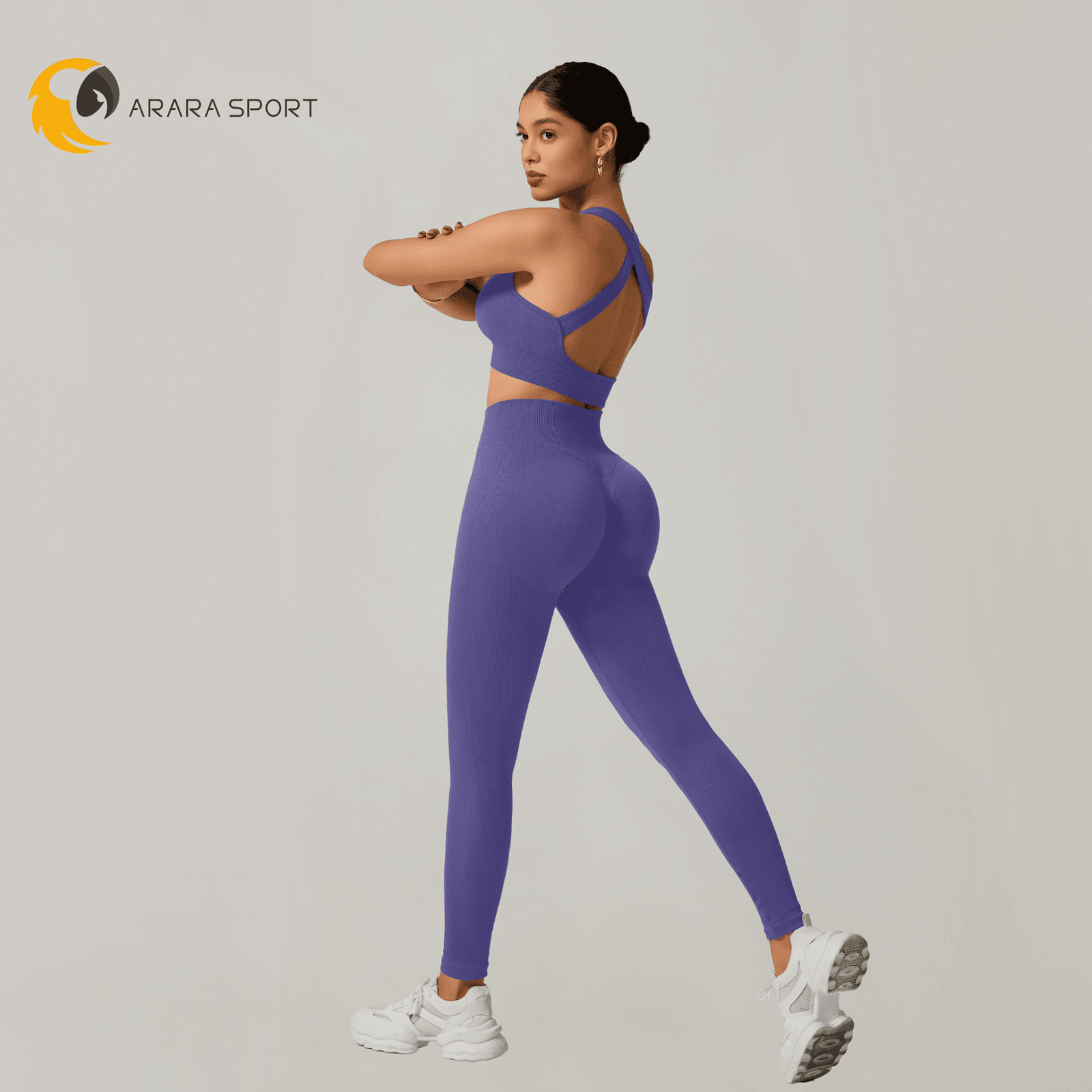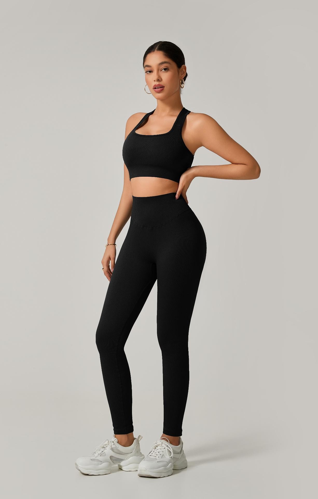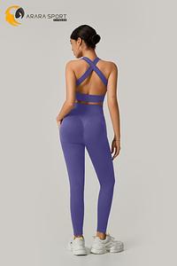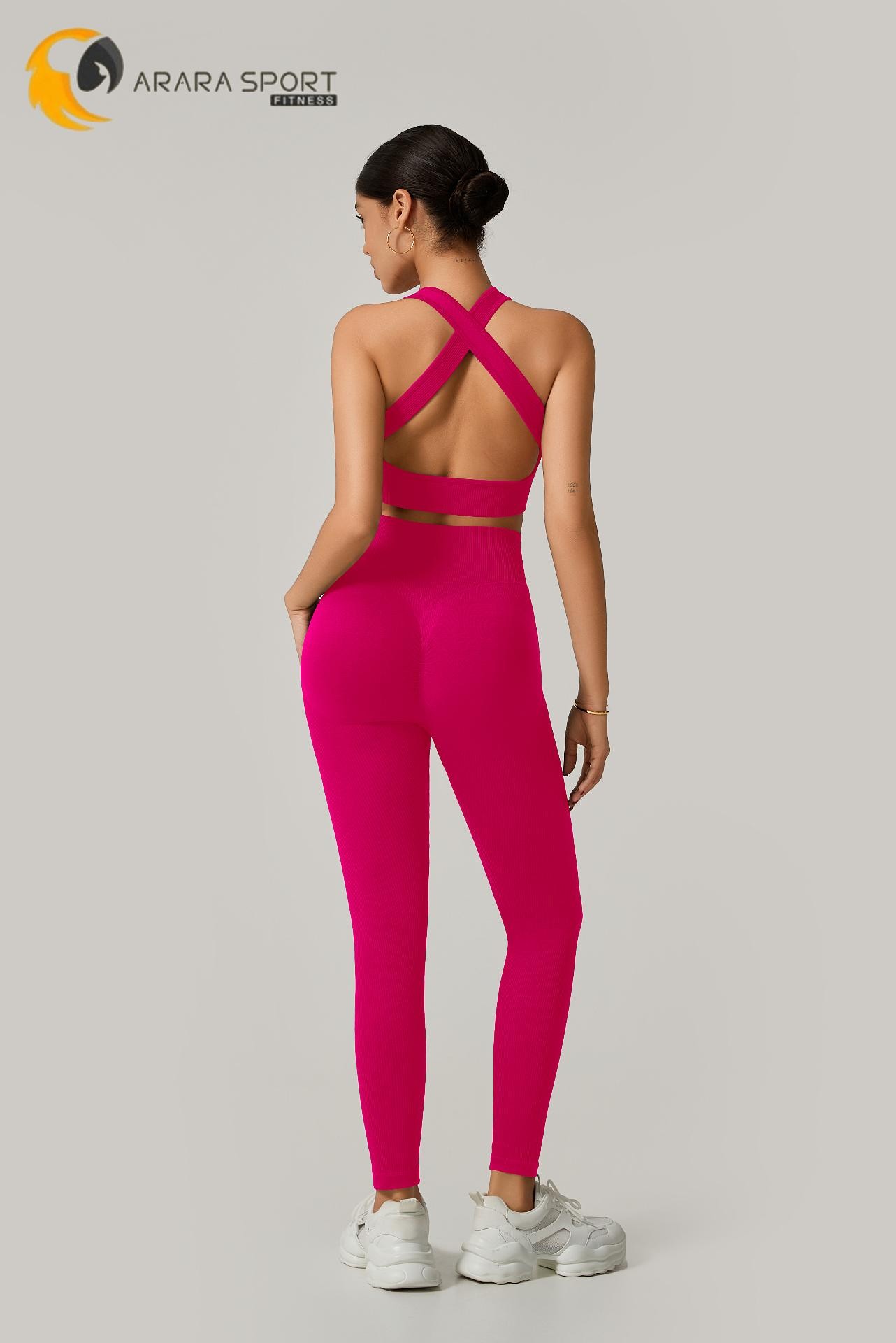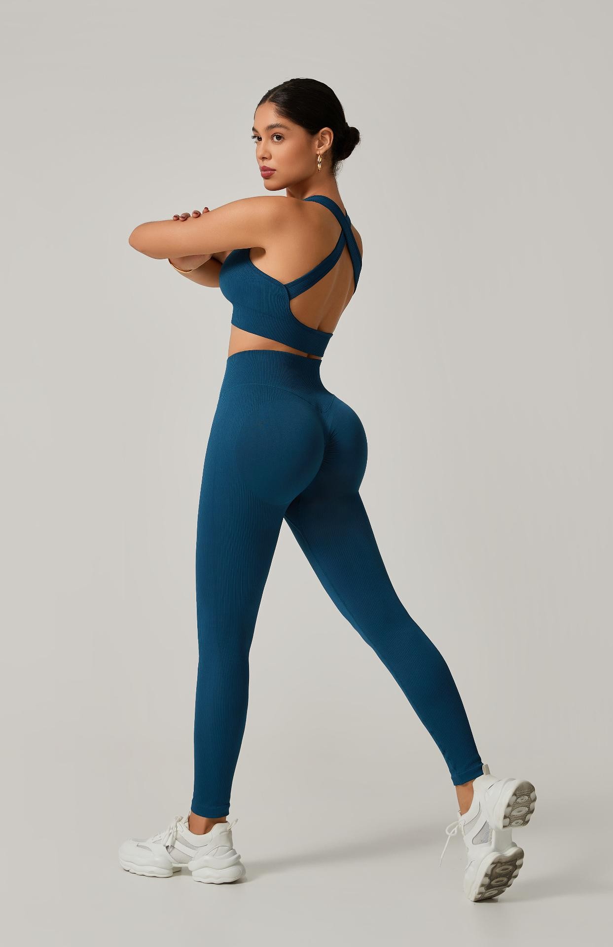 A legging de cintura alta com modelagem empina natural valoriza o corpo e oferece sustentação, enquanto o top de alça grossa com costas cruzadas garante firmeza e conforto em cada exercício.