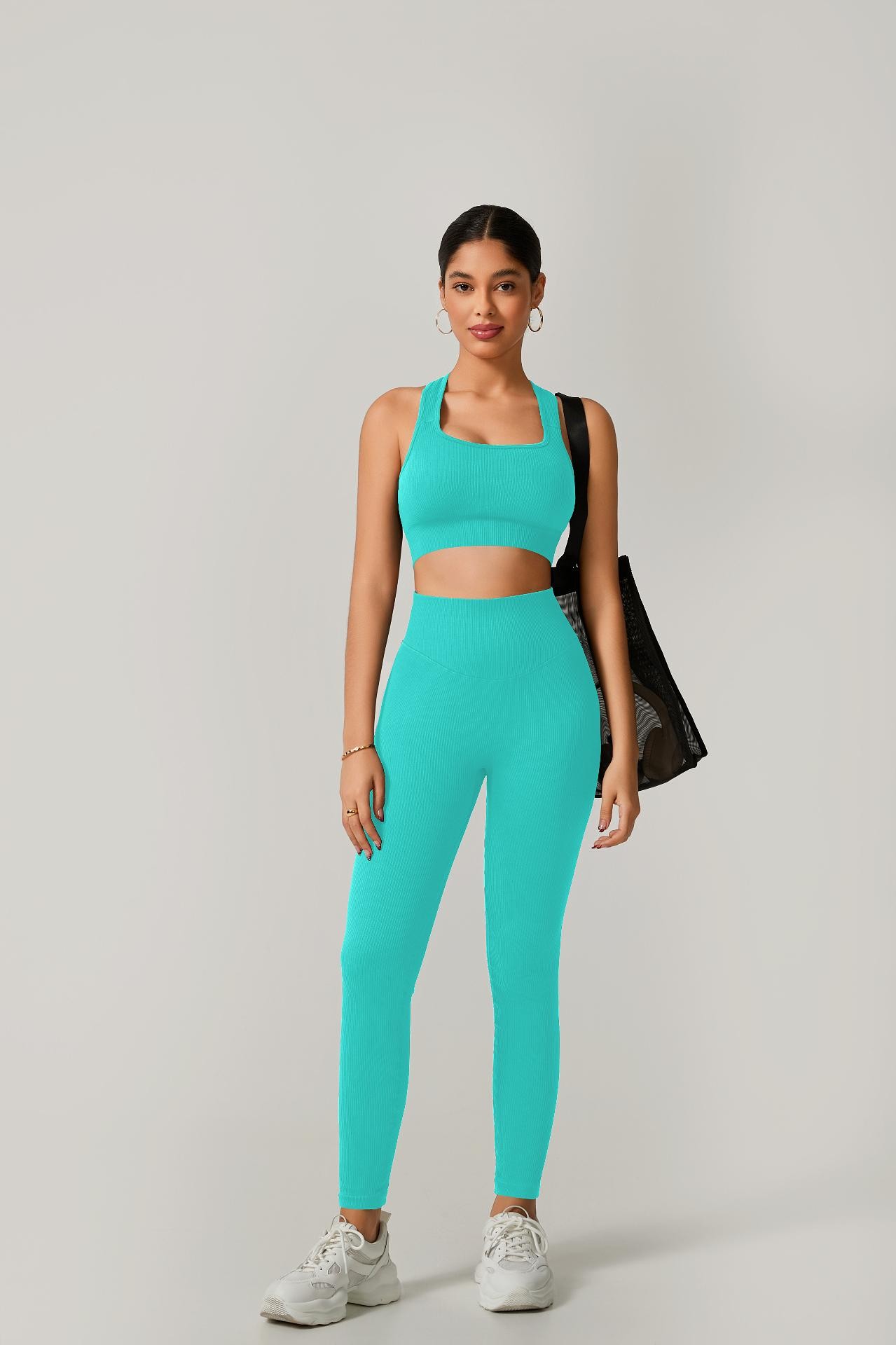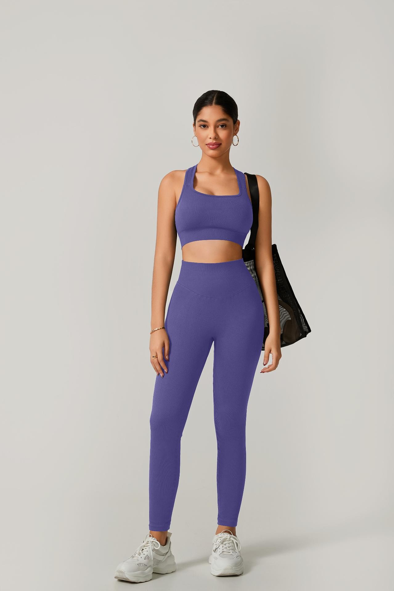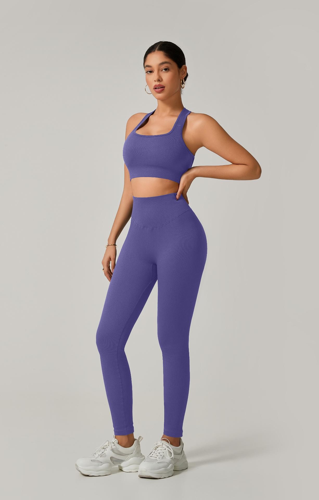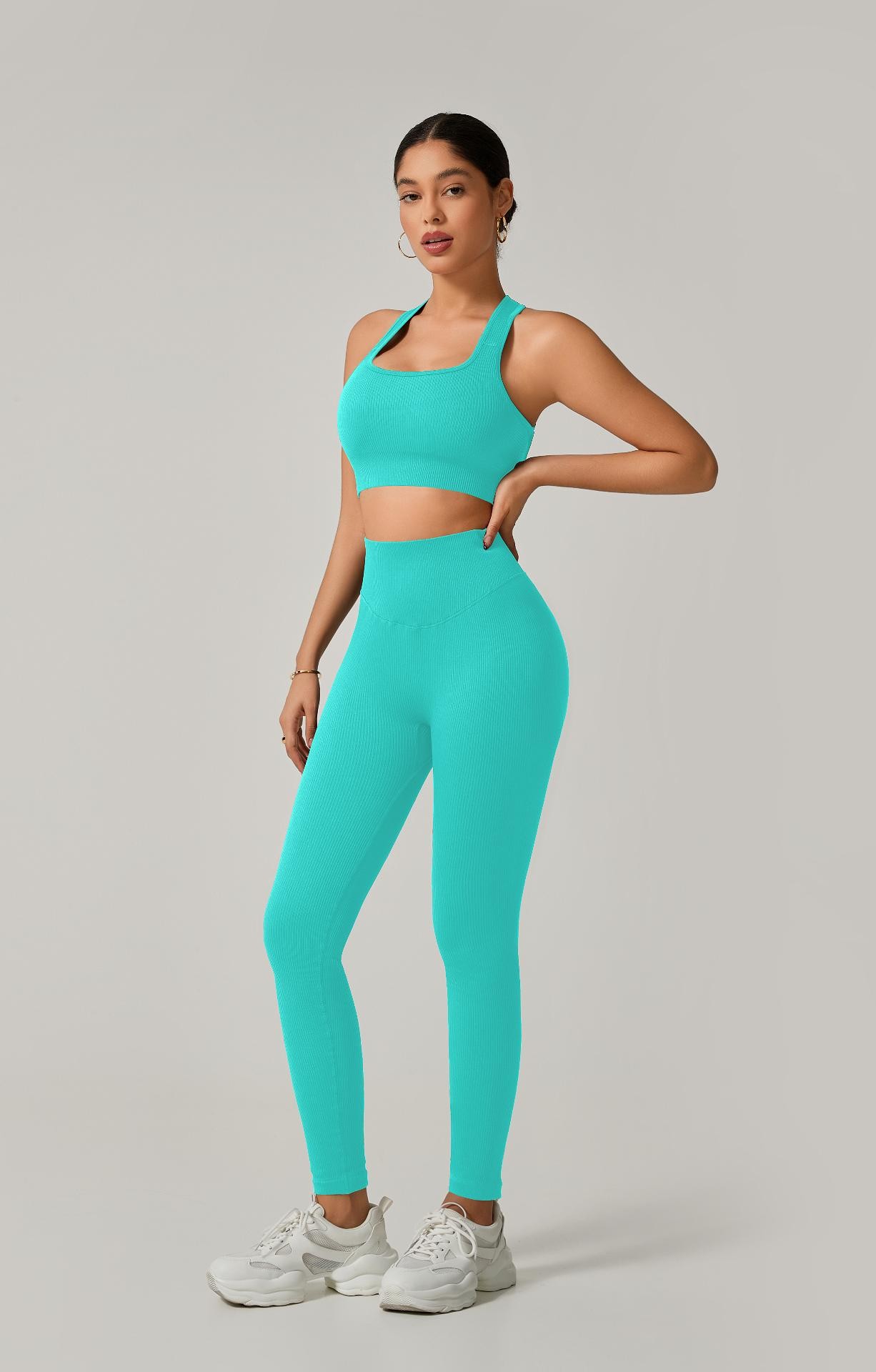 A legging de cintura alta com modelagem empina natural valoriza o corpo e oferece sustentação, enquanto o top de alça grossa com costas cruzadas garante firmeza e conforto em cada exercício.