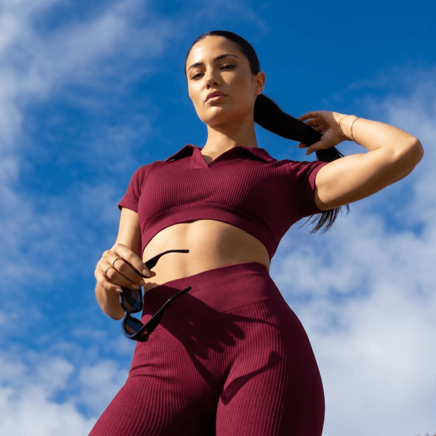 A calça cintura alta modela a silhueta com firmeza e conforto, enquanto o cropped estilo polo traz um visual sofisticado e diferenciado, com toque esportivo. Modelagem sem efeito empina, garantindo caimento natural e confortável.